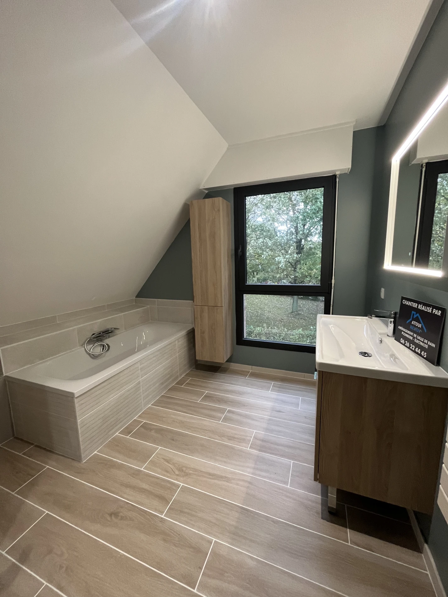 Réalisation d'une rénovation de salle de bains à Loos, incluant la reprise de la plomberie et de l'électricité, la pose de carrelage et installation des équipement sanitaires.